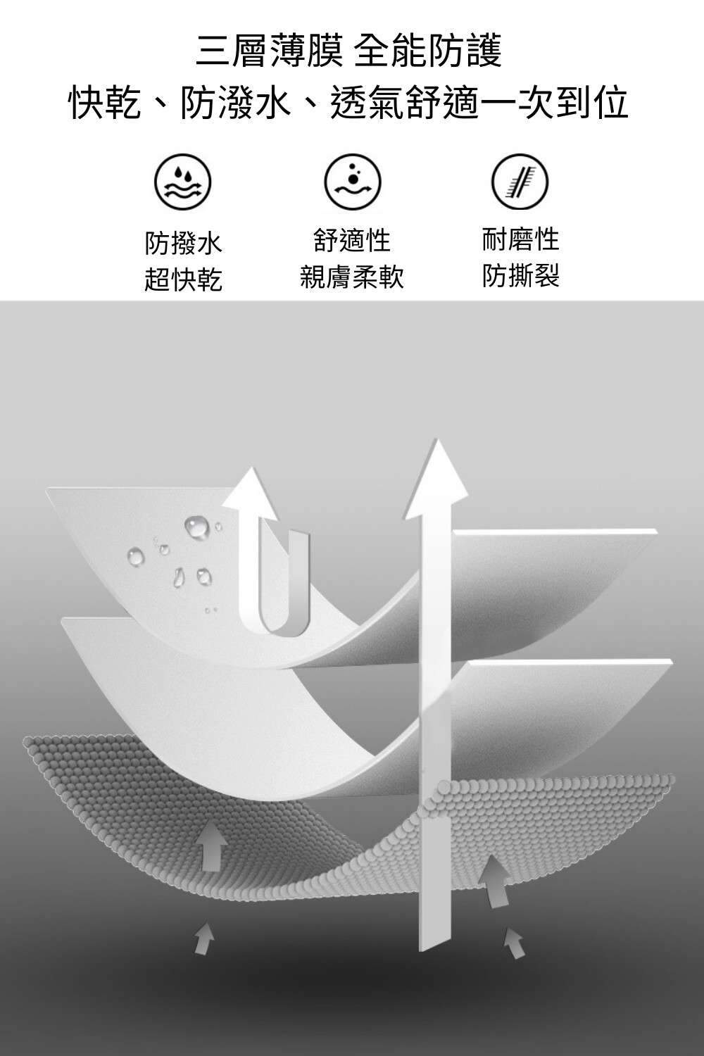 ✔️外層快乾撥水、中層高效防雨、內層透氣排濕