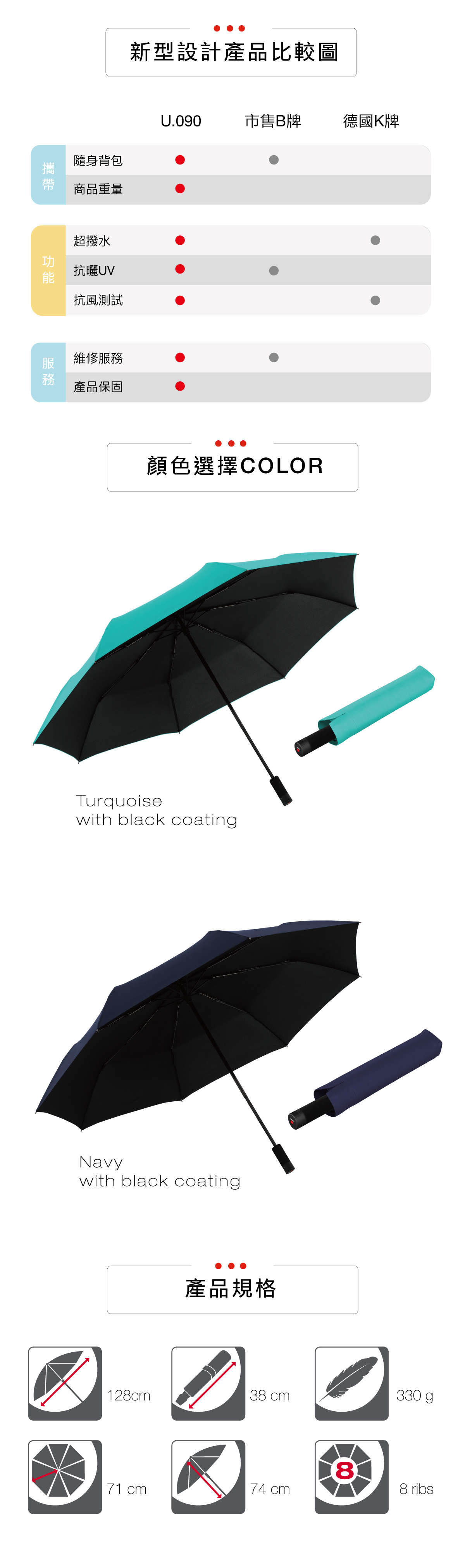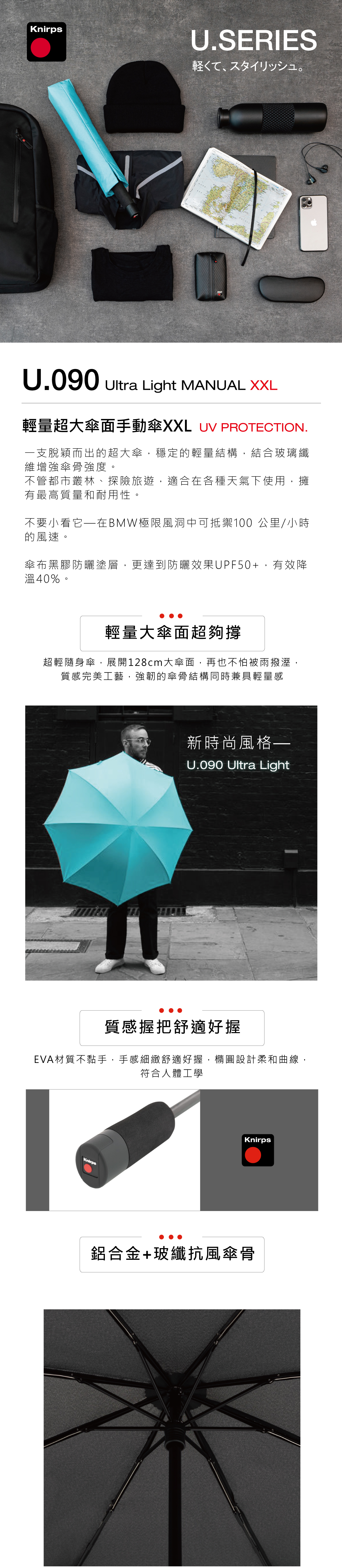 輕量隨身傘XXL,展開128公分大傘面,強韌的傘骨結構同時兼具輕量感。