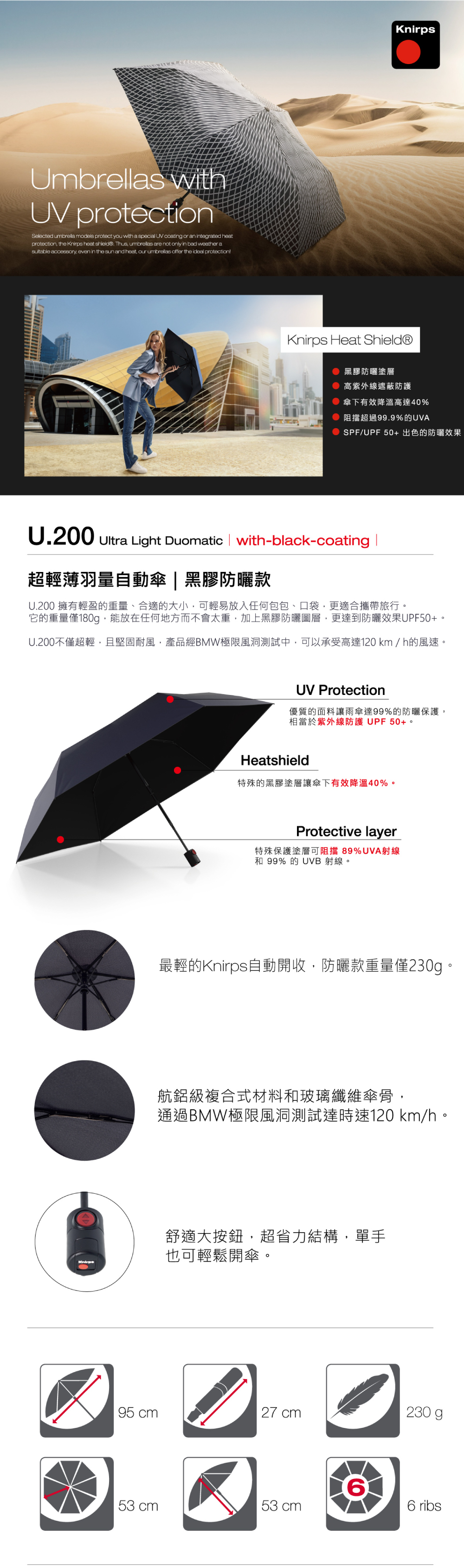 輕量防曬首選|Knirps90年品牌新創世界上最輕自動傘,黑膠防曬圖層有效降溫40%,遮蔽紫外線達UPF50+