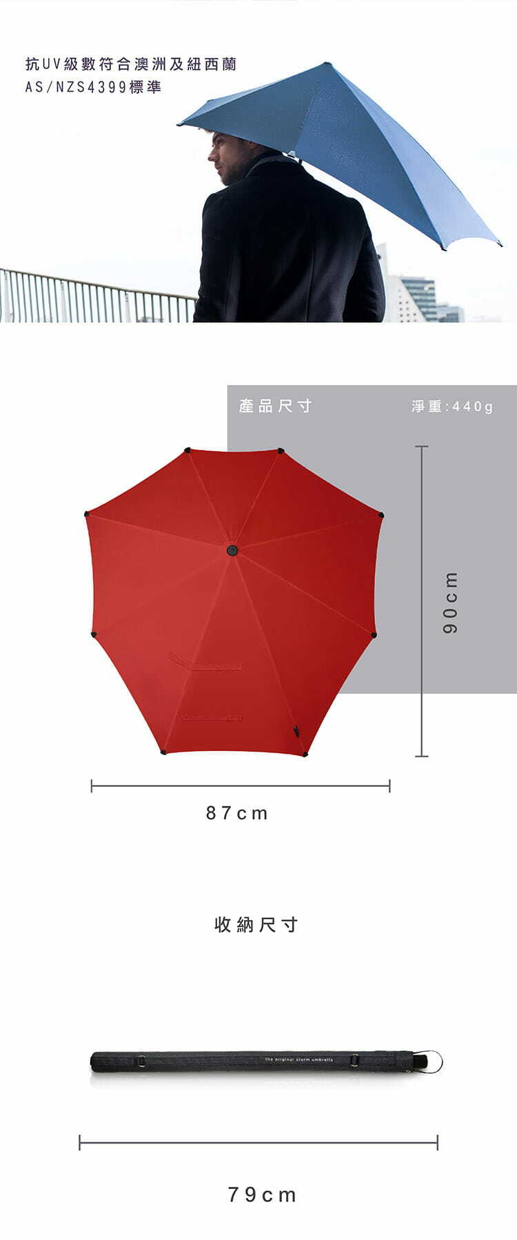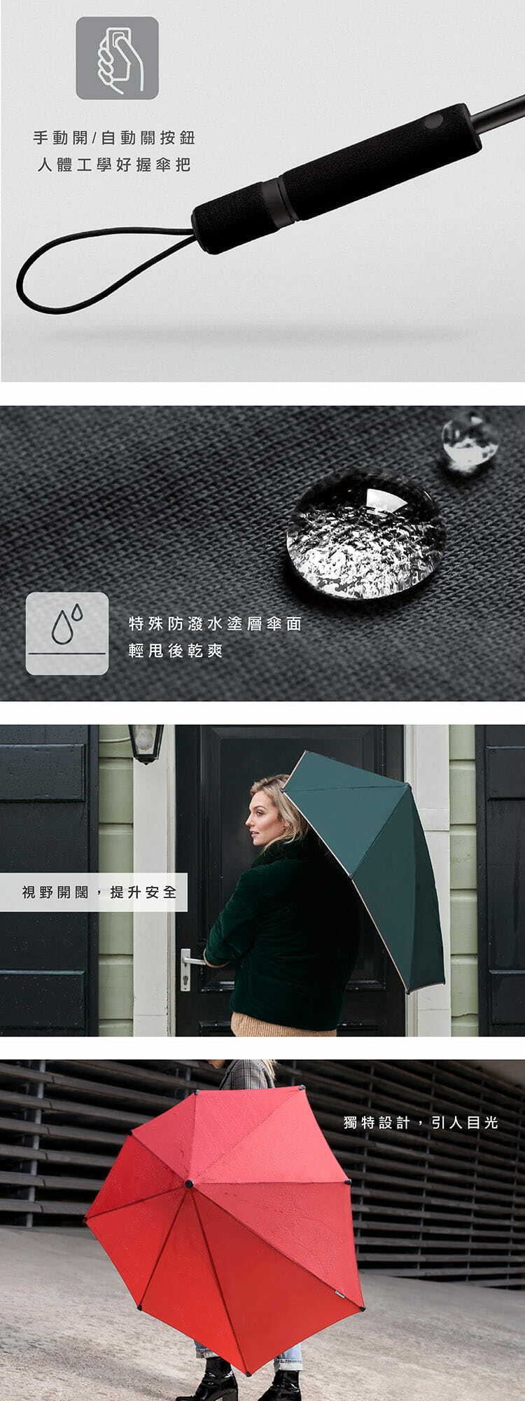 ・防雨防紫外線(UPF50+)。 只需打開和關閉傘,傘布就會變乾,因此您可以將傘摺疊收納起來,不用怕水珠遺留在上面。
