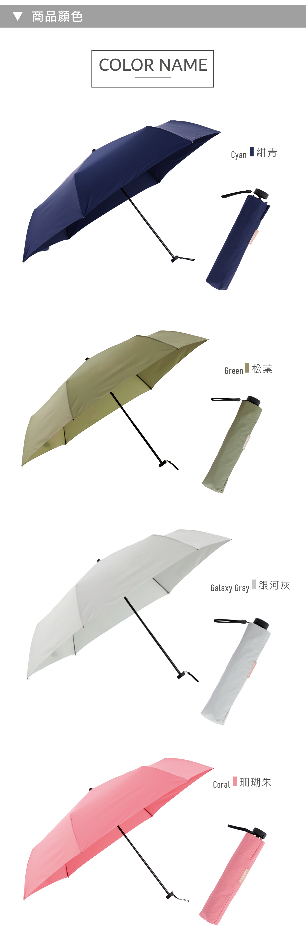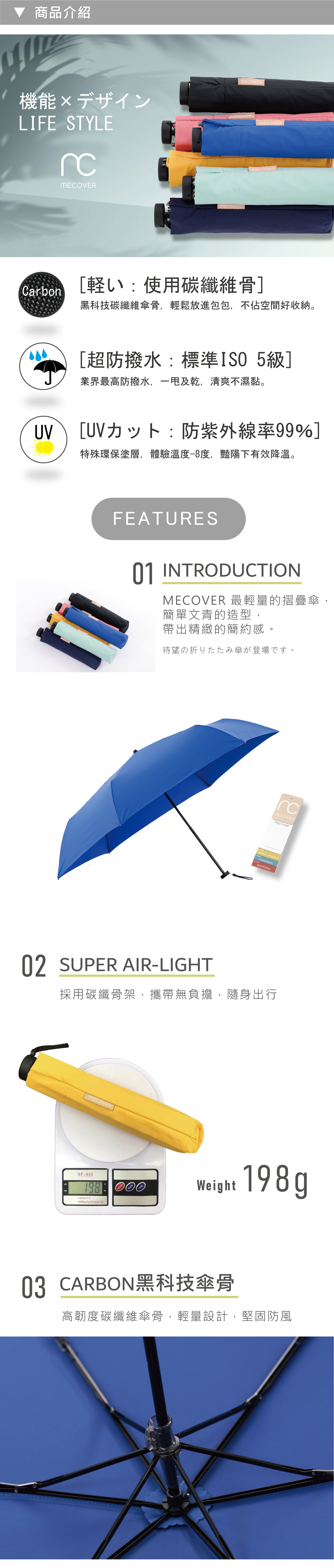 碳纖維傘骨,重量僅198克,輕量便攜無負擔